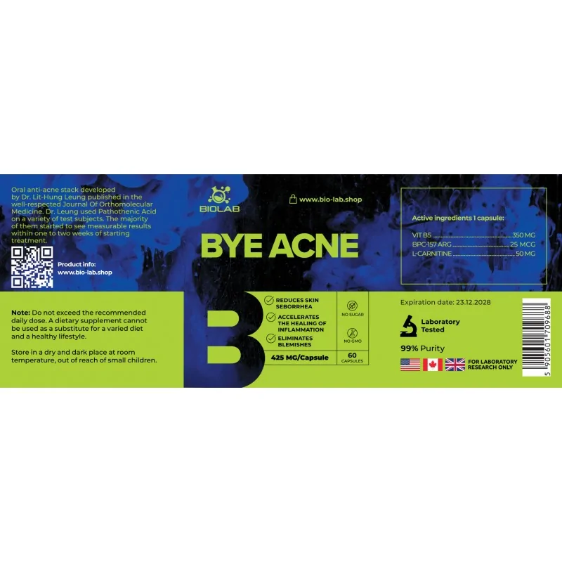 Vitamīnam B5 ir ārkārtīgi svarīga loma tauku vielmaiņā. Atbalstot enzīmu aktivitāti, Bye Acne atbalsta vispārējos vielmaiņas procesus.