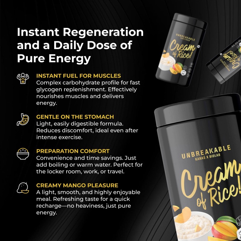 Vēlaties izmēģināt un sajust atšķirību reģenerācijā? Tas ir ideāls brīdis, lai izmēģinātu Cream of Rice Karaś x Biolab un izbaudītu jaunu uztura kvalitāti pēc treniņa.