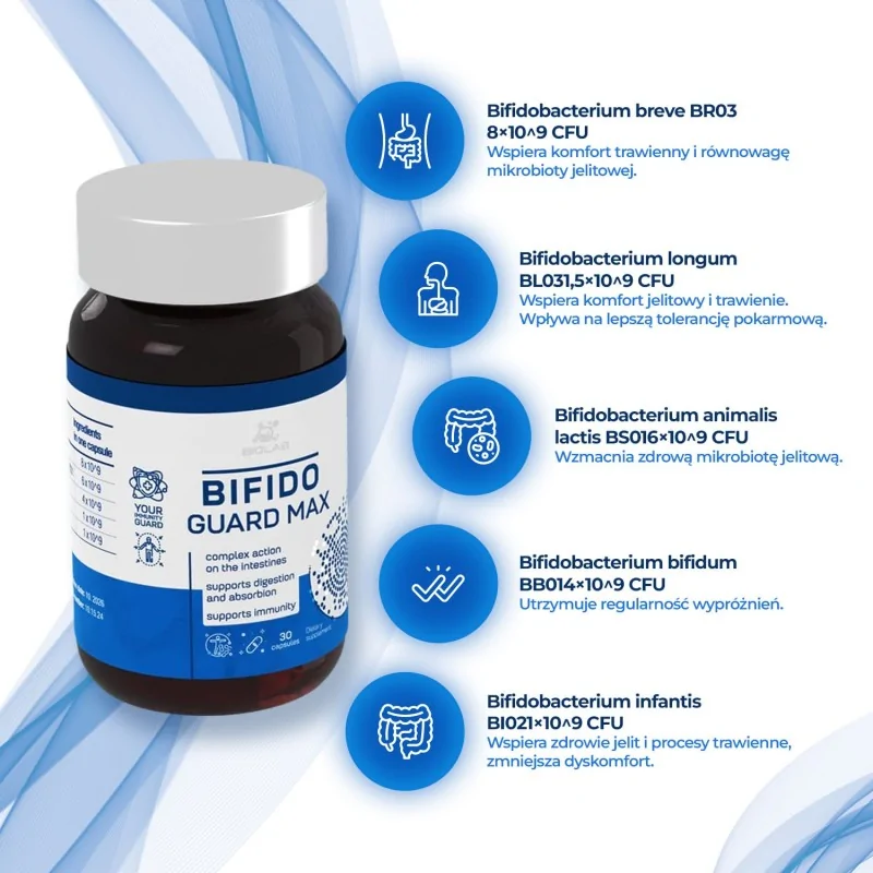 Poznaj Bifido Guard Max - kompleksowy probiotyk z pięcioma szczepami Bifidobacterium, łączący 20,5×10^9 CFU w jednej kapsułce