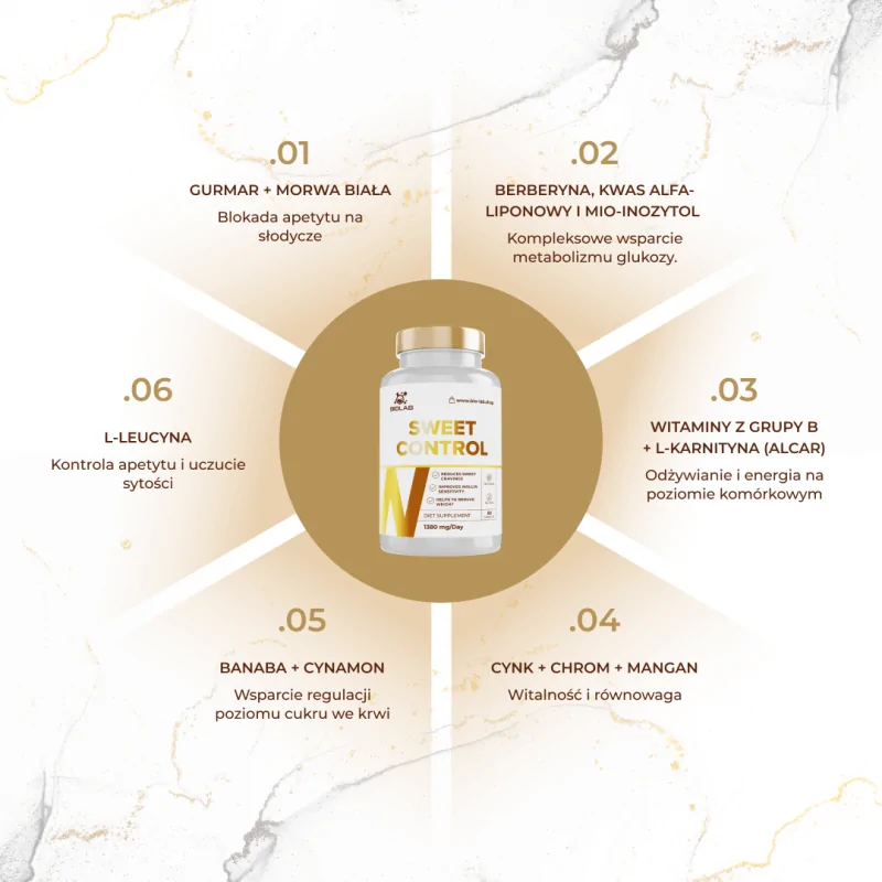 Sweet Control to kobiecy suplement diety opracowany z myślą o wsparciu codziennej kontroli apetytu na słodycze, metabolizmu i ogólnej równowagi organizmu. Formuła łączy ekstrakty roślinne, aminokwasy i minerały, które dobrze wpisują się w świadomą suplementację ukierunkowaną na dobrą formę, codzienny komfort i większą kontrolę nad dietą. To wsparcie dla kobiet, które chcą łatwiej utrzymać swoje założenia żywieniowe i ograniczyć momenty, w których słodkie zachcianki przejmują kontrolę.
