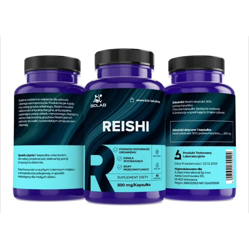Skład: ekstrakt reishi 30% 500mg, otoczka żelatynowa, mąka ryżowa