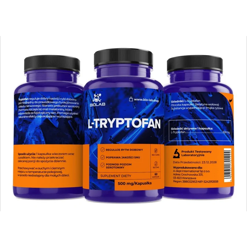 Skład: L-tryptofan 500mg, otoczka żelatynowa, mąka ryżowa