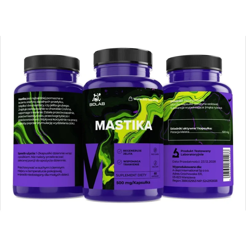 Mastika to suplement z kategorii wspierających prawidłową pracę jelit. Mastyks to żywica pozyskiwana z drzewa Pistacia lentiscus var. Chia, niskiego wiecznie zielonego drzewa o tysiącletniej tradycji uprawy i użytkowania. Mastika jest mieszaniną setek związków, co może tłumaczyć jej szerokie spektrum działania. W samym tylko olejku eterycznym z żywicy mastiksowej znajduje się ponad 60 związków aktywnych biologicznie.
