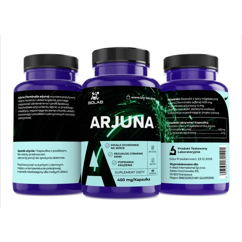 Skład: ekstrakt z kory migdałecznika arjuna Terminalia arjuna 400mg w tym kwas arjunowy 4mg, otoczka żelatynowa, mąka ryżowa