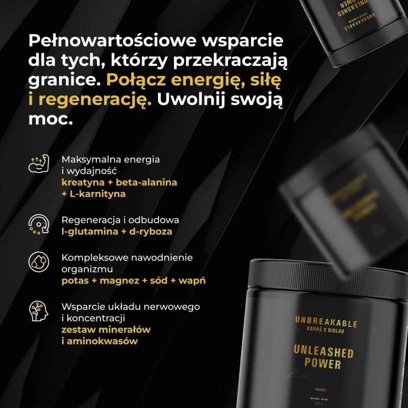 Zamów Unleashed Power z linii UNBREAKABLE Karaś x Biolab już dziś i doświadcz energii, koncentracji i regeneracji na nowym poziomie - dla sportowców i każdego, kto chce przekraczać swoje granice.